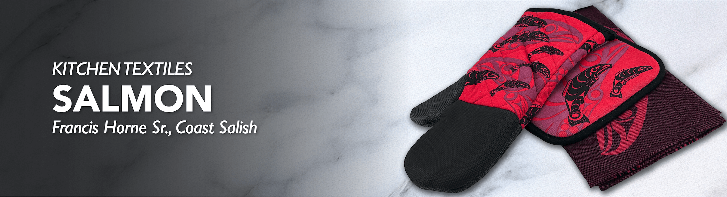 Explore the Native Northwest Salmon by Francis Horne Sr. Kitchen Textiles Collection. Building Everyday Connections to Canadian Indigenous Cultures. 100% of the art featured on Native Northwest products is designed in Canada by Indigenous artists.